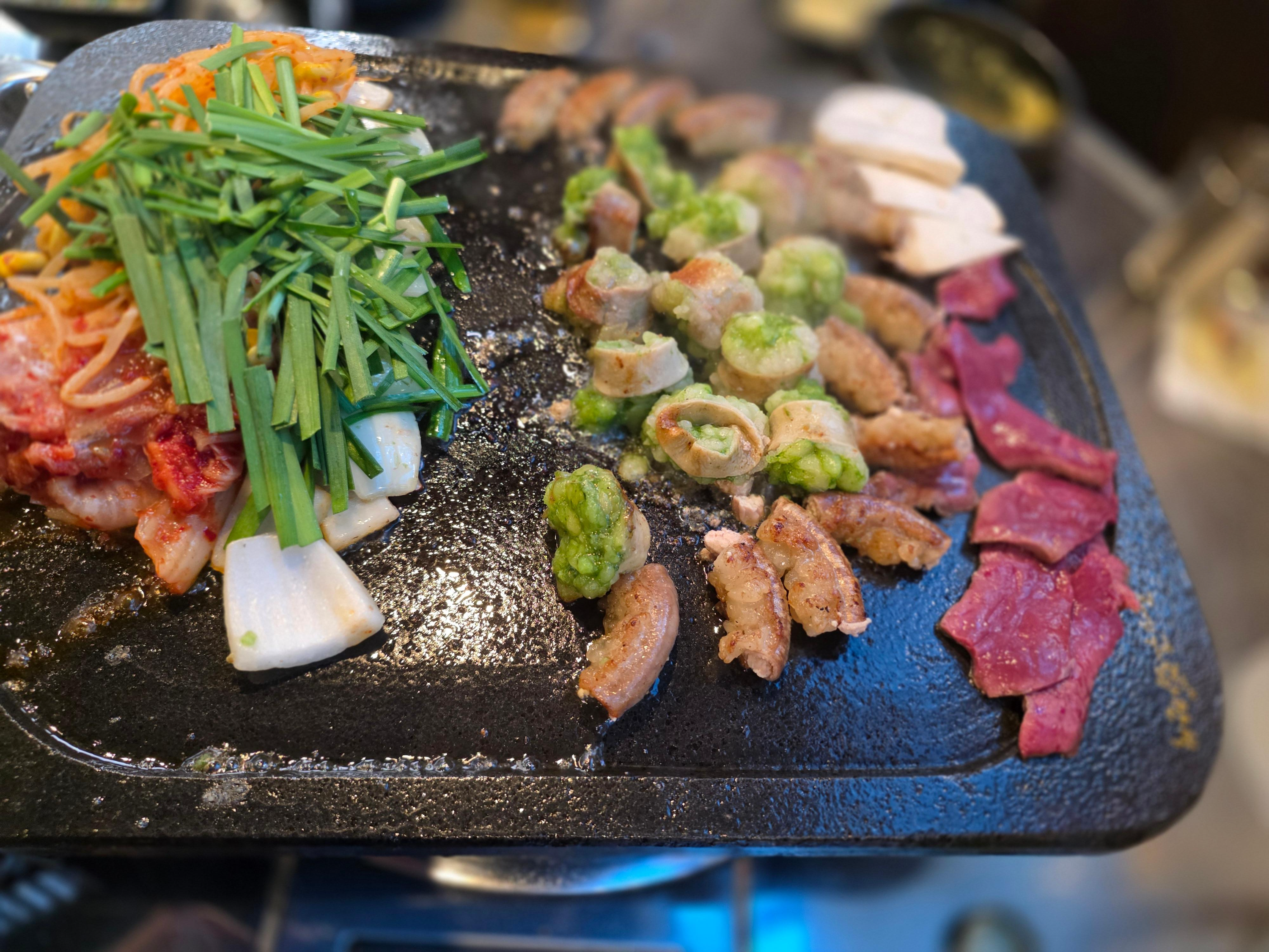 고소한 향이 올라오는 철판 위에 곱창과 , 대창, 김치와 양파 등
