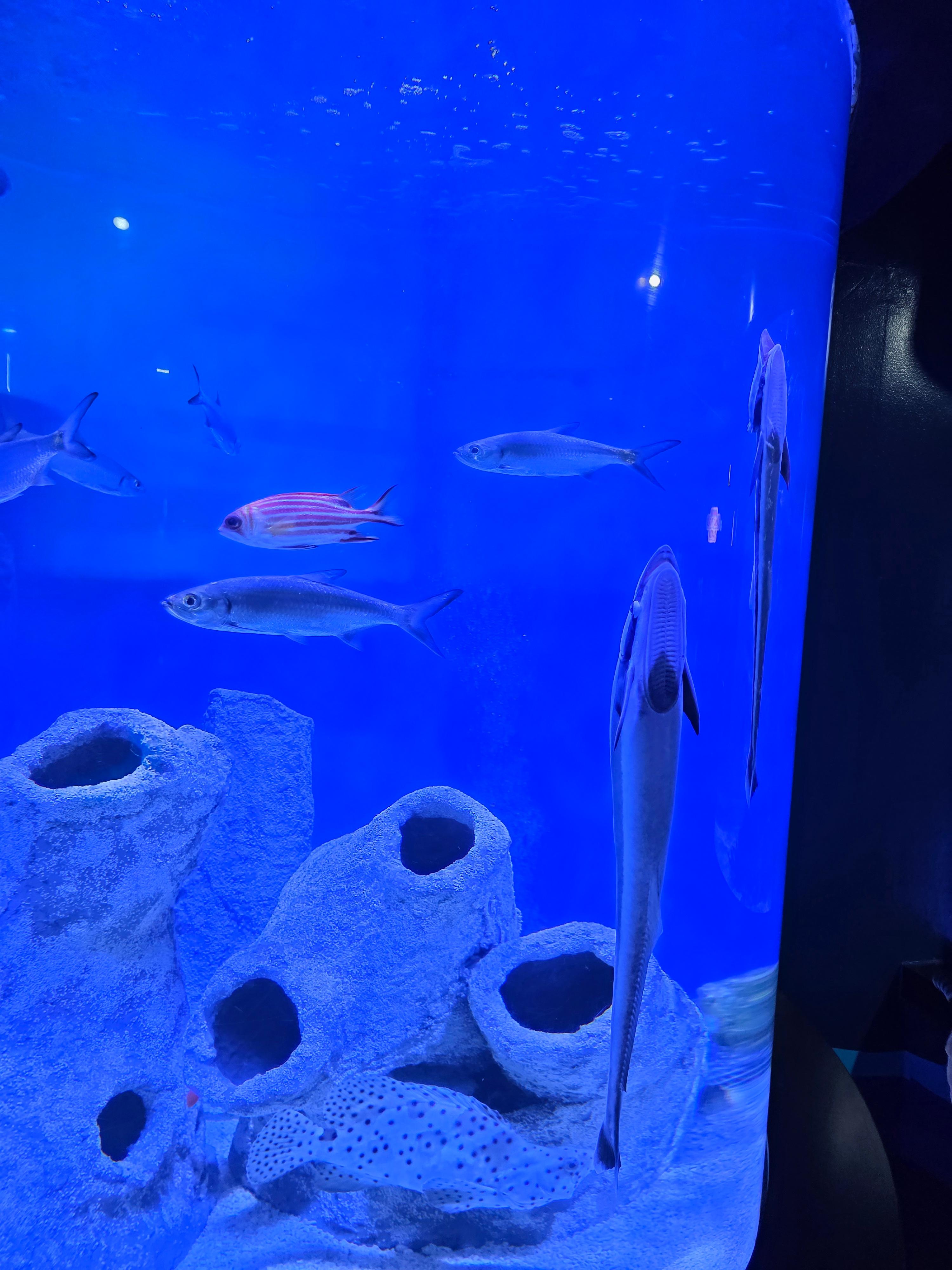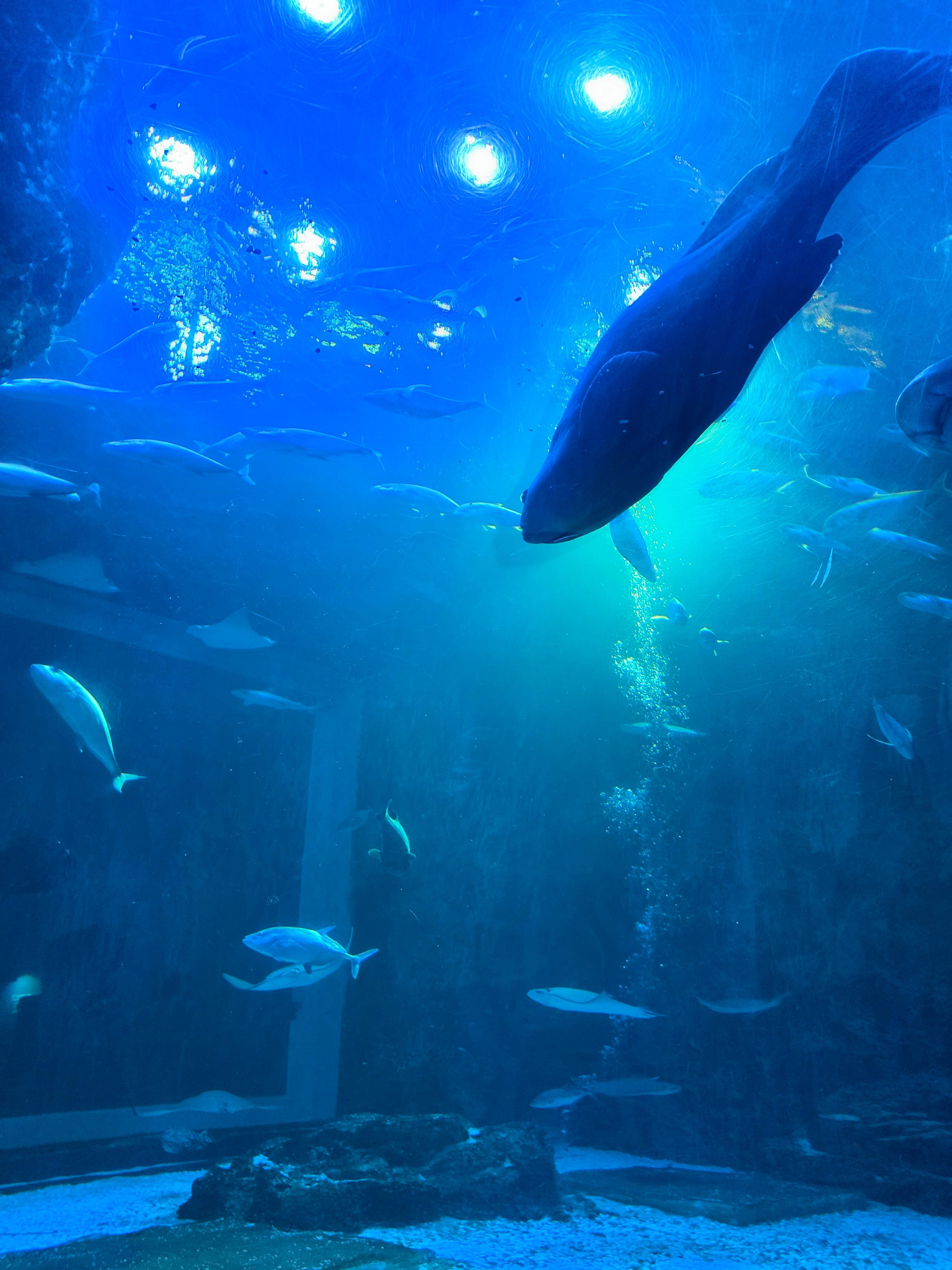 거대한 수조 안을 유유히 헤엄치는 은빛 물고기 떼! 멍하니 보고 있으면 시간 가는 줄 모르는 '물멍' 타임입니다.