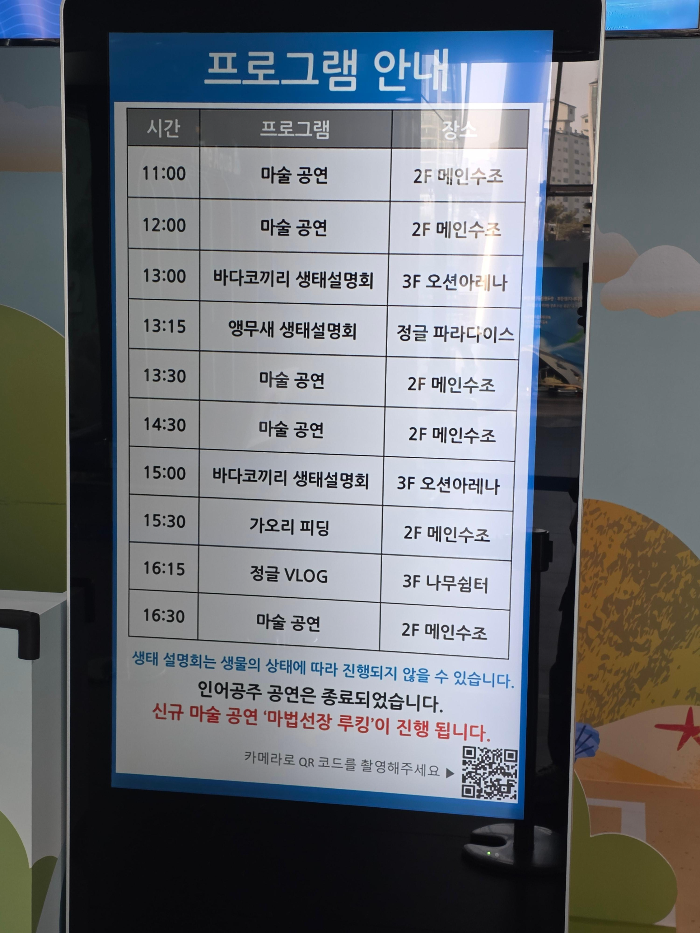 아쿠아플라넷의 하이라이트는 역시 공연과 생태 설명회죠! 방문 전에 시간표 꼭 체크하세요.
