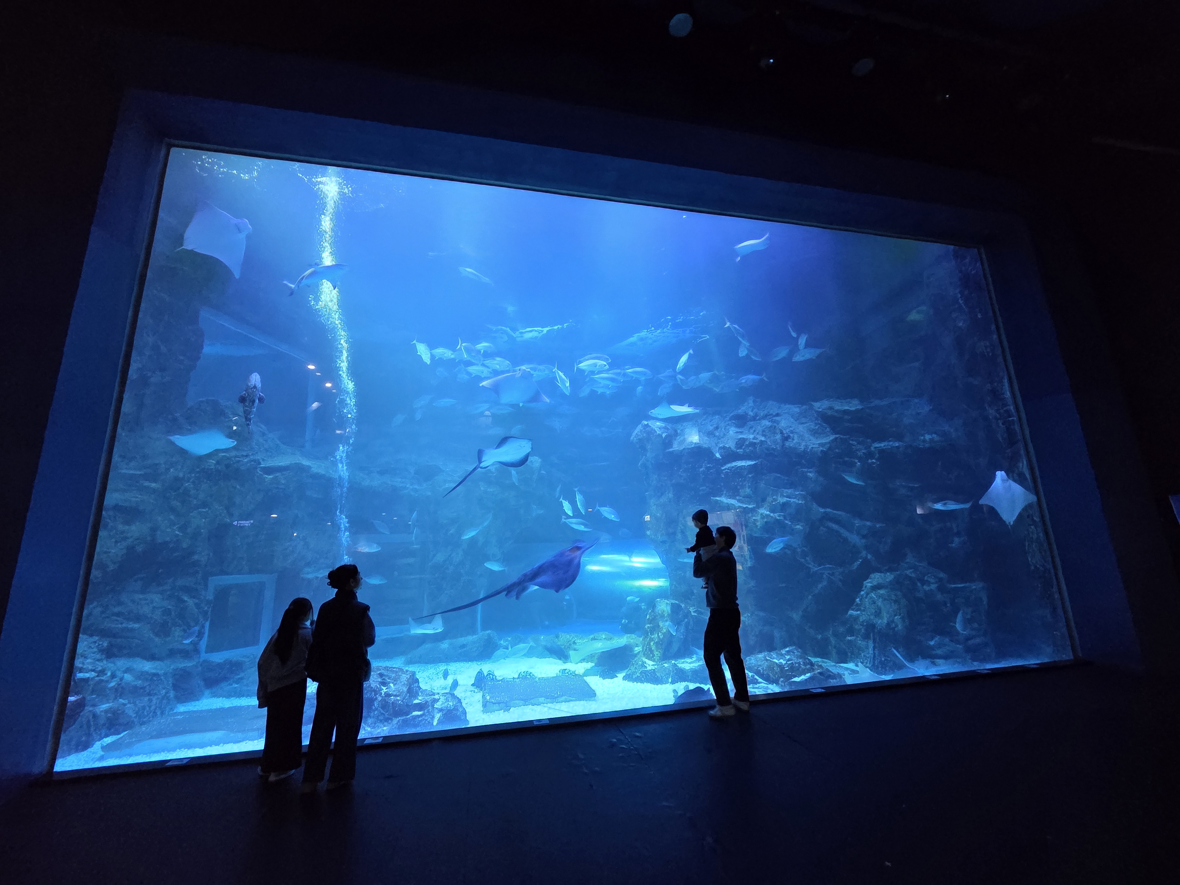거대한 수조 안을 유유히 헤엄치는 은빛 물고기 떼! 멍하니 보고 있으면 시간 가는 줄 모르는 '물멍' 타임입니다.