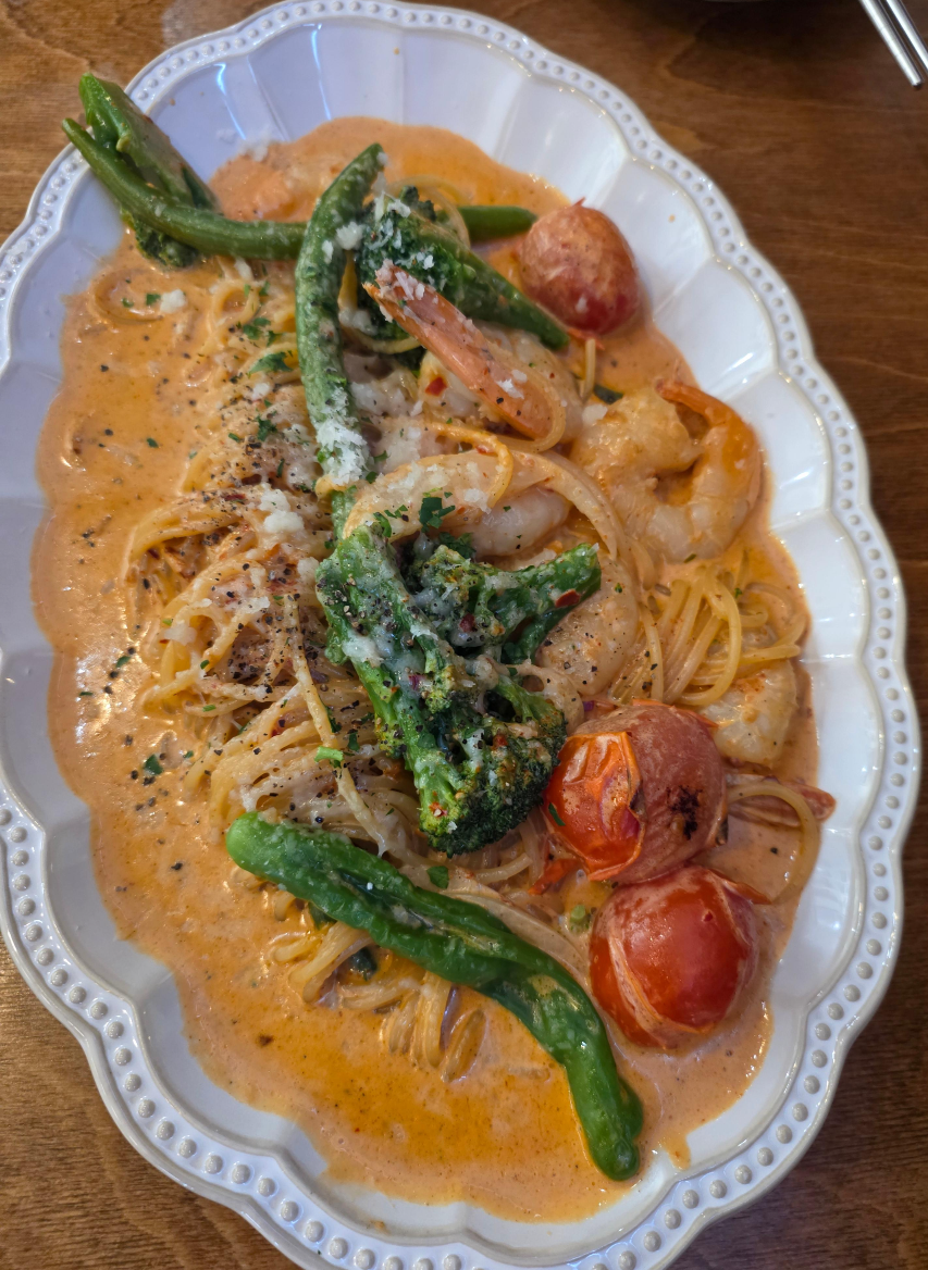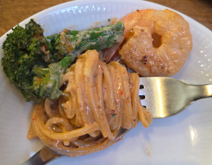 돈가스만 먹기 아쉬울 때 강력 추천하는 파스타! 🍝 '감베로(Gambero)'는 새우를 뜻하는데요. 통통한 새우와 브로콜리, 방울토마토가 들어간 로제? 크림? 베이스의 소스가 일품입니다. 살짝 매콤함이 감돌아서 튀김 요리의 느끼함을 싹 잡아줘요.