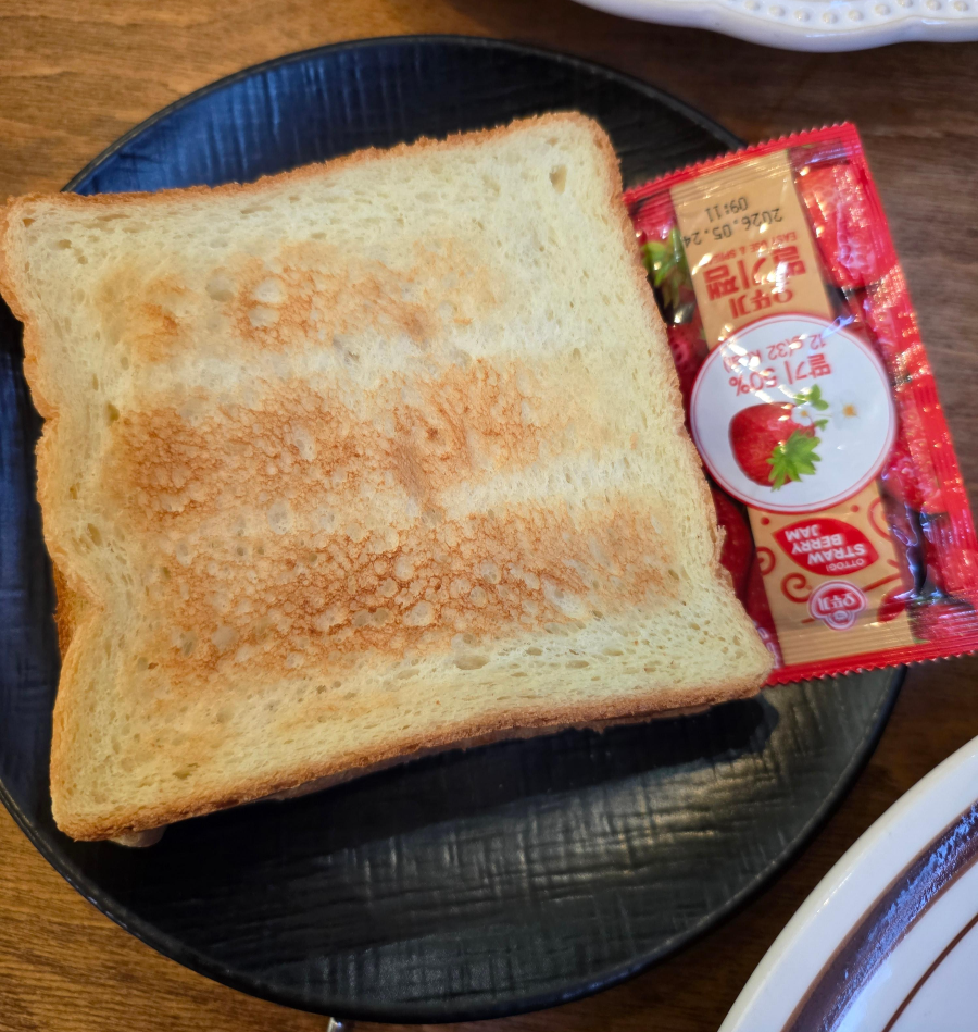 토스트 & 딸기잼: 바삭하게 구운 식빵에 달콤한 딸기잼 조합... 이건 못 참죠. 🍓