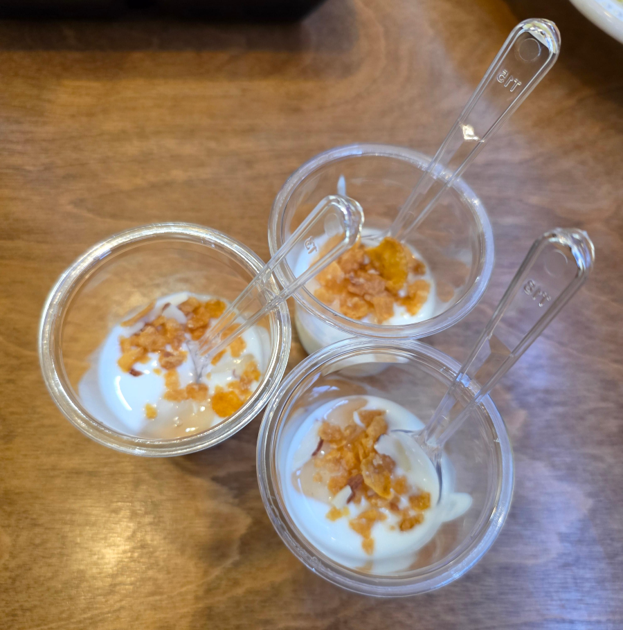 식사가 끝날 때쯤 제공되는 귀여운 요거트 디저트! 상큼한 요거트 위에 시리얼이 토핑되어 있어서 입가심으로 최고였어요.