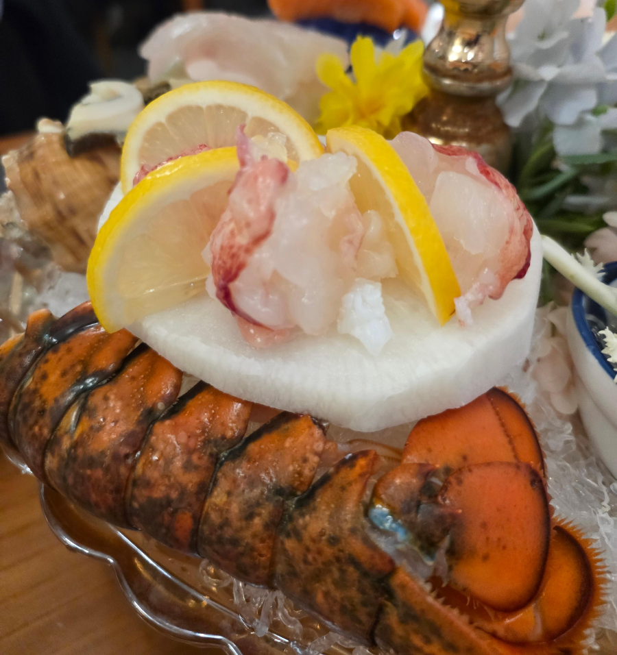 드디어 첫 번째 메인급 등판! 화려한 비주얼의 랍스터 회가 등장했습니다.