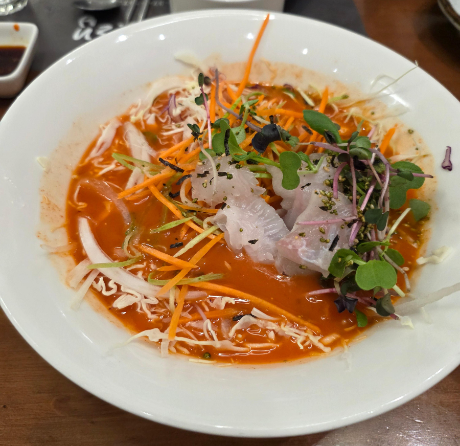 따뜻한 스프로 속을 달래고, 새콤달콤 시원한 물회, 고소한 메로 가마살 구이,