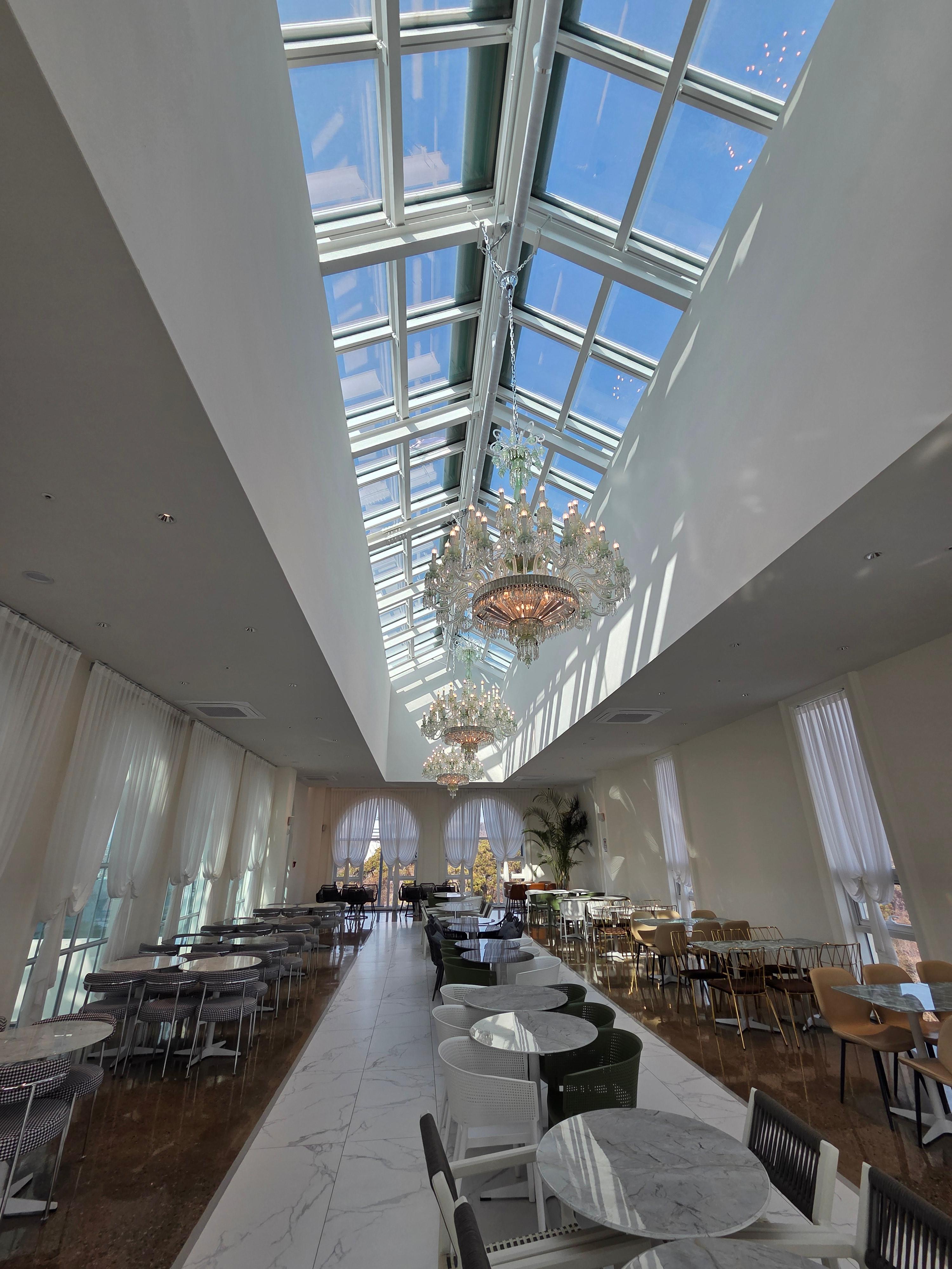 유리 천장으로 쏟아지는 자연광이 실내 식물원 특유의 화사함을 더해주네요.