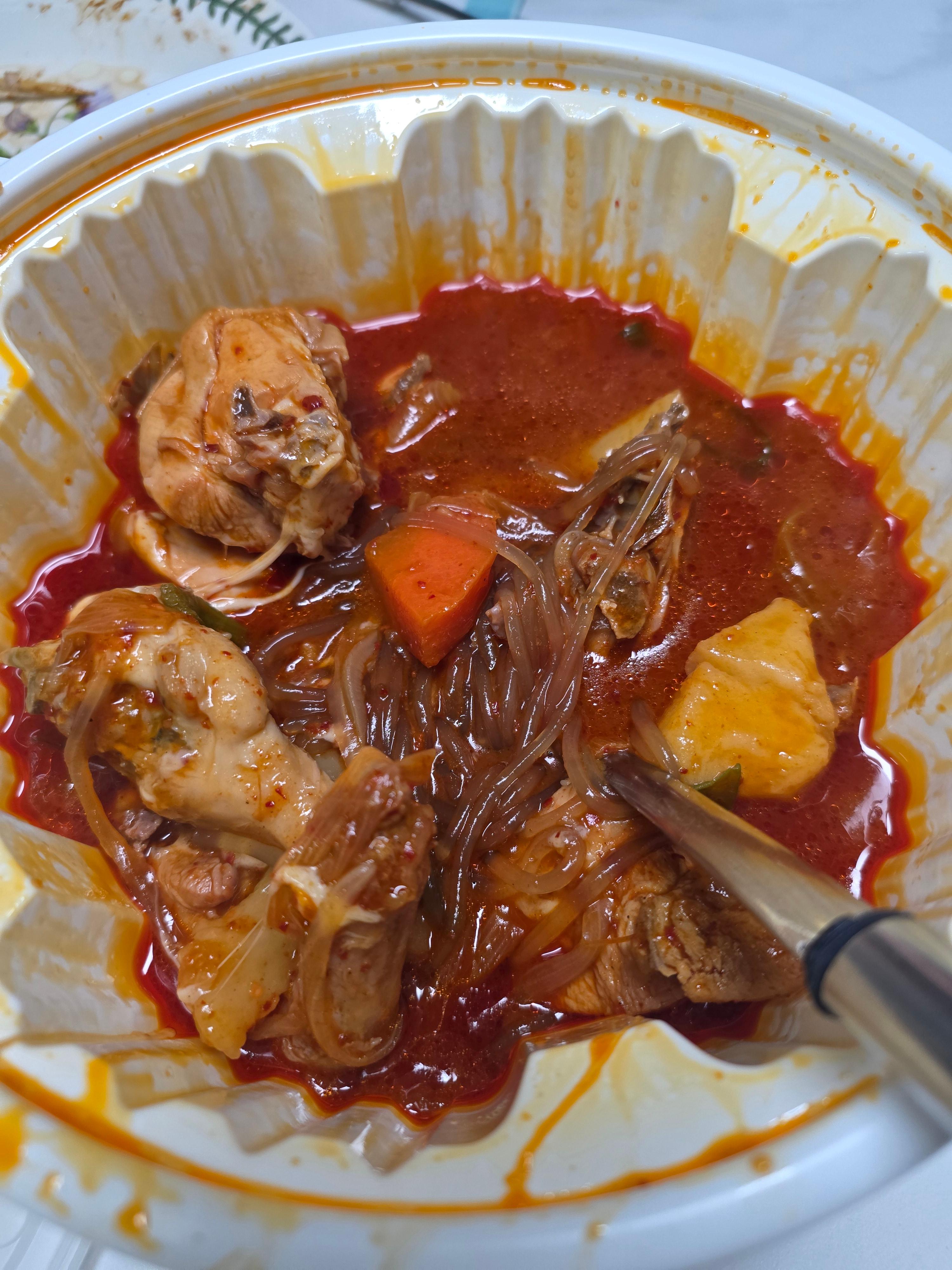 닭이 큼직하게 들어 있고, 감자·당근·당면까지 꽤 푸짐해요.