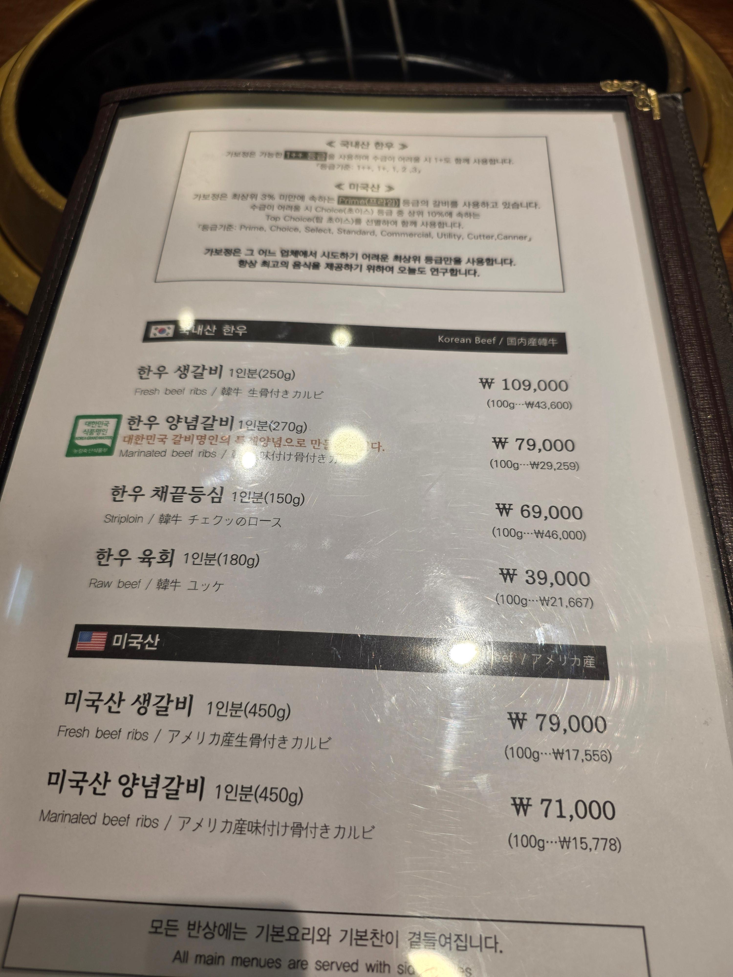 메뉴판을 펼치니 한우 생갈비, 한우 양념갈비, 채끝등심 등 다양한 한우 부위가 눈에 들어왔어요.