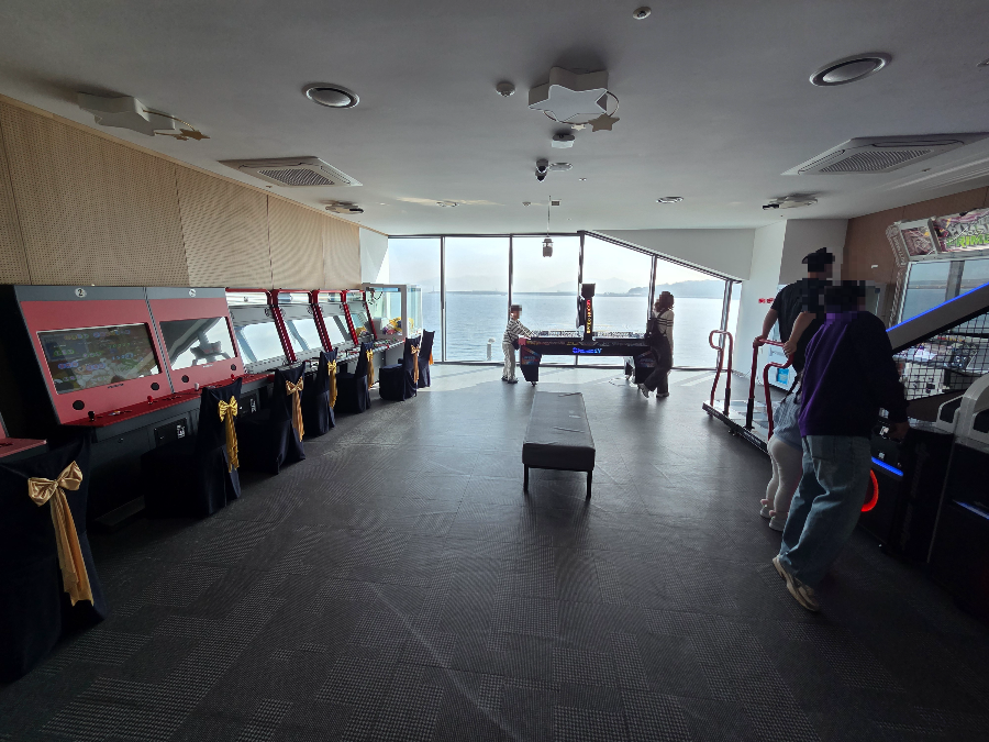 무려 **'오션뷰 오락실'**이에요! 바다를 보며 에어하키를 치고 게임을 즐길 수 있다니,